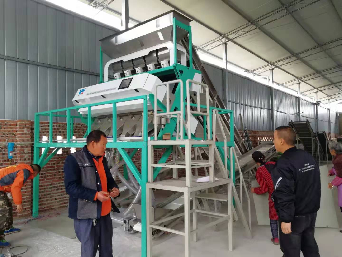 Raw materials are put into the machine from its material hopper on the top, vibrated by vibratiory feeder and sliding along material chute into the zone of observation in sorting chamber through sensors and background plate. Under the effect of lamps source, CCD sensor receives compound light from materials being sorted. According to the light intensity and color changes, make the system produce output signal and drive solenoid valve(ejector) to work, ejecting the discolor grain to reject chamber and good materials continue to fall into the finished accept chamber